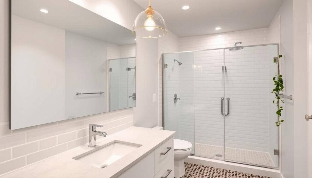 Small bathrooms look better with modern fixtures. Wall-mounted vanities and sleek toilets make tight spaces look elegant. These upgrades are key to a bathroom makeover that’s both fancy and functional.