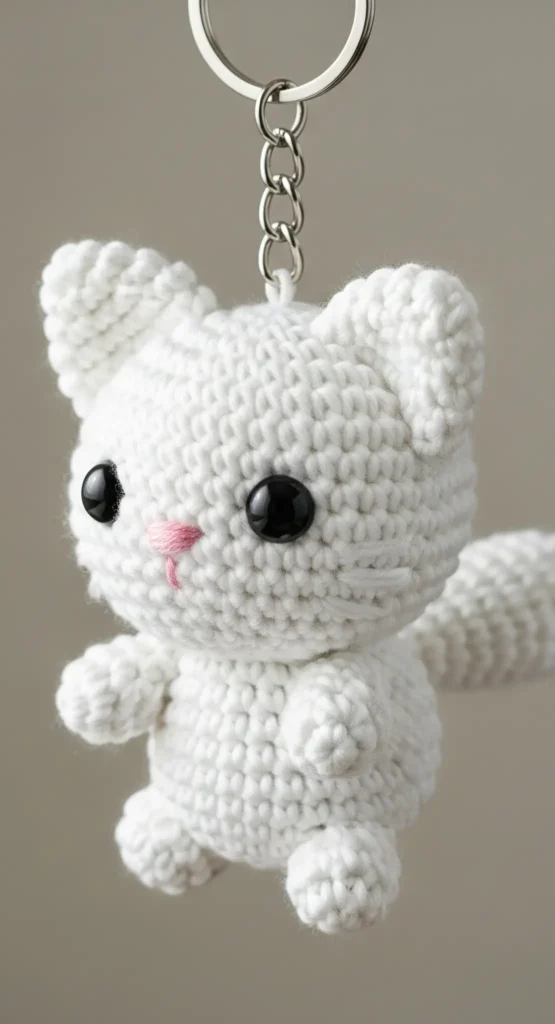 - Keychain: Using a strand of white yarn, create a sturdy loop at the very top center of the head. Thread this loop through the last link of the keychain chain and secure it tightly. Alternatively, you can directly sew the keychain ring to the head. Weave in all remaining ends.