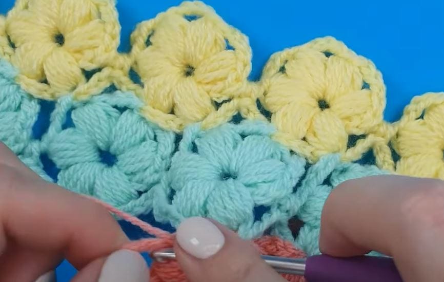 - Fifth Row (Contrast B): Chain 3, then work 1 extended double crochet, 1 dc in the next dc Ch 1, skip the next dc, 1 dc in the next dc. 1 extended dc, 1 dc in the next dc repeat from * to end of row. Turn.