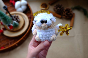- Chain a length of stitches using white yarn that is sufficient to thread through your desired “eyelets” and tie a small bow. You may need to experiment to find the perfect length for your miniature size.