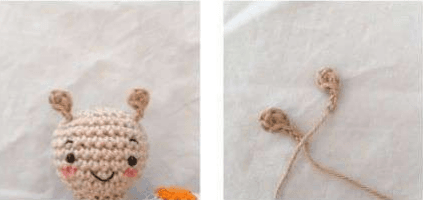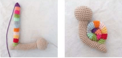 - Round 8: Ch 7, skip 7 sts, insert hook into the 8th st, sc 8. [15] (This makes the curve of the snail’s body!)