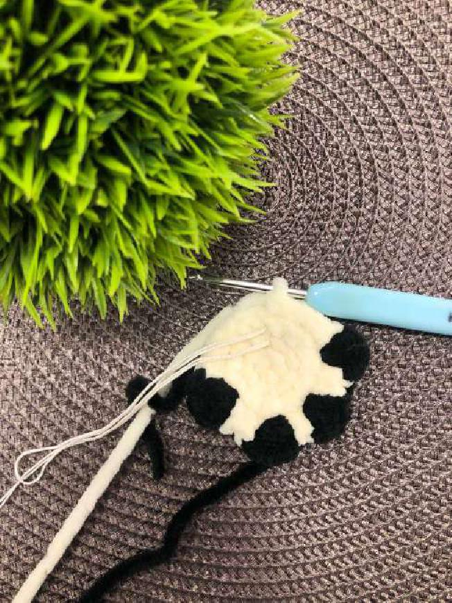 In the next few rounds, we will be making the cow’s spot! The instructions in [Bold Brackets] should be worked in Color B (Black).