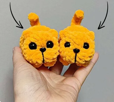 7. 2 sc, paw (puff stitch from 4 dc), 2 sc, paw, 2 sc, (1 sc, inc) x 3. 1 sc (18) – increases should be at the center of the back.