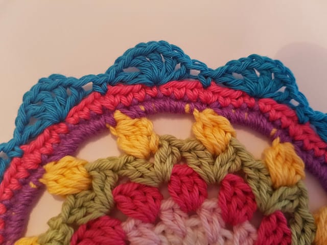 • Ch 1, then 6Sc in each Ch5 sp, 1sc in top of each popcorn. Sl st to beg ch. Fasten off and join Colour C into sc above a popcorn st. [84sc]