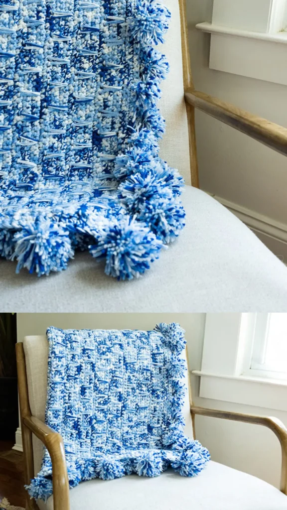 The Afghan was photographed with optional pom-poms. The yarn amount is sufficient to make pom-poms, but we strongly suggest that if this Afghan is meant for a baby or child, you do not add pom-poms, as these are a choking hazard.