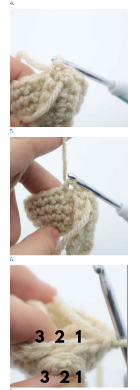 - Row 1: Ch 7. Sc 4 times into the 2nd Ch from the hook. Sc in the next st. Sc in the next st. Sc into the next st.