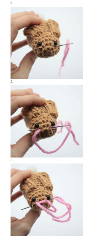 Using pink yarn and a needle, insert the needle on the right side of the face and exit under the left eye. Repeat this 2 times to create a simple, cute horizontal nose.